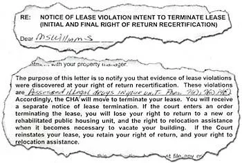 On May 29, some nine months after her arrest on August 29, 2001, Jennie Williams was evicted from her apartment at Stateway Gardens. She was evicted, although the criminal case arising from the events of August 29 is still in progress. The eviction cost her not only her home in a community where she has lived for more than twenty years, it also cost her the benefits of lease compliance under the CHA’s Plan for Transformation—a Section 8 voucher and the opportunity to return to the mixed income development to be built at Stateway. In the course of the eviction case, her claim that she was the victim of police misconduct was never heard and considered by the judge.